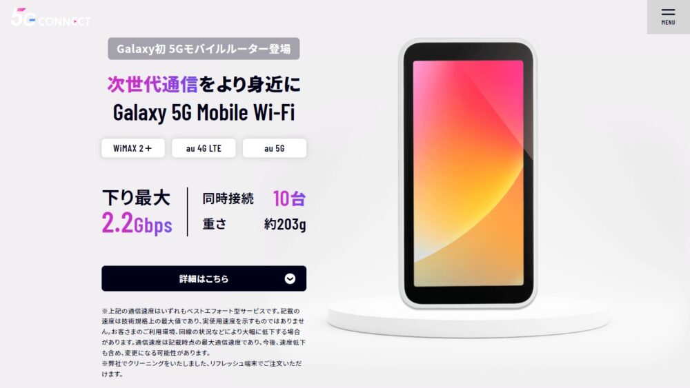 下り最大2.2Gbps、最大同時接続10台など、外観はもちろんスペック的にも他社モバイルルーターより高性能なgalaxy初の5G対応機種です。