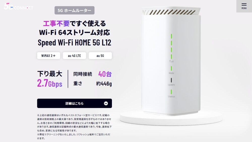 WiMAX 2+・au 4G LTE・au 5Gすべてに対応、さらに下り最大2.7Gbps、最大同時接続10台という置くだけWiFiとして十分なスペックなのがこちら。