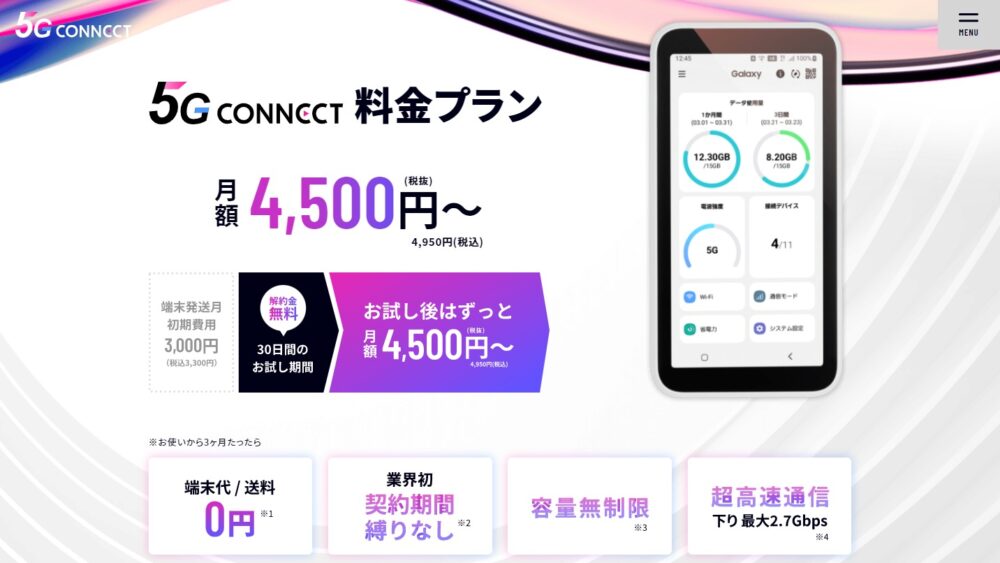 期間に縛られず、話題の5Gモバイル回線を体感したい!という方には5Gコネクトがおすすめの一社です。