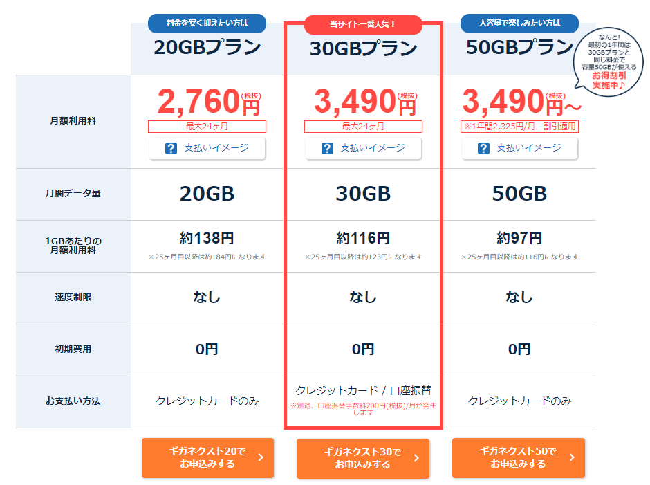 と20GB、30GB、50GBの3つから選べ、どのプランも契約期間は2年間。GMO、Broad WiMAX、カシモWiMAXと立て続けに2年→3年契約と移行しているWiMAXプロバイダとちがい契約期間が2年間と短いのも嬉しい部分ですね。