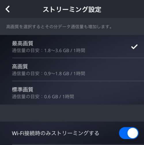 デフォルトのストリーミング設定は「最高画質」となります。