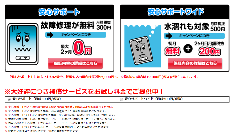 ※ 安心サポートがご不要の場合は端末発送月の翌月以降にBBnaviよりお手続きください。出典:GMOとくとくBB「安心サポート注意書き」