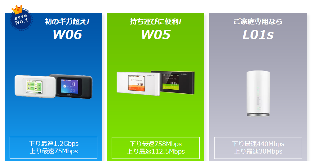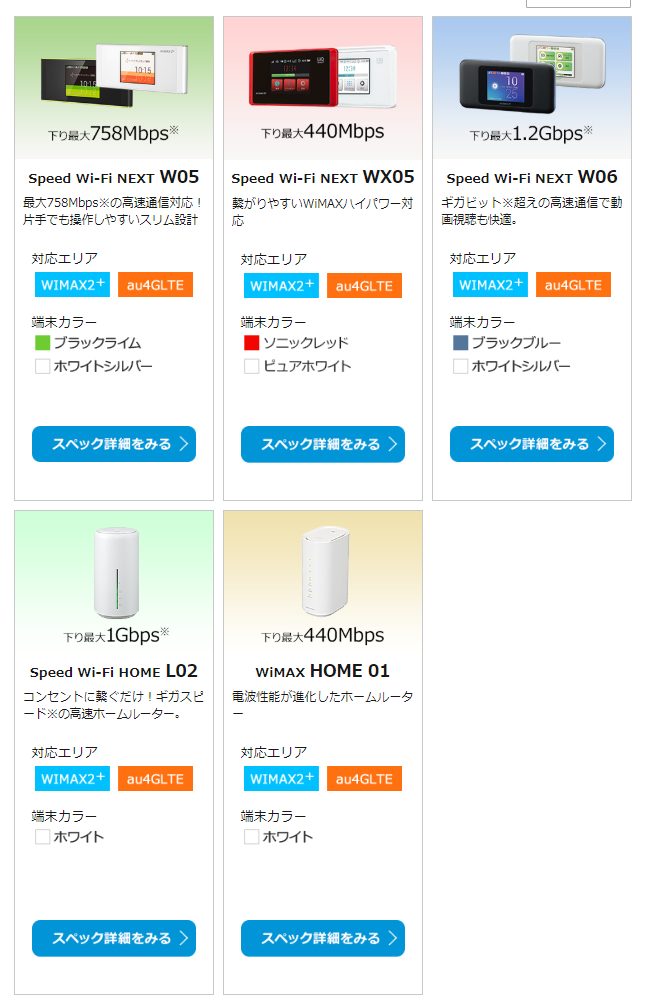 対するJP WiMAXはすべてHUAWEI製の3機種。モバイルルーター2機種と置くだけwi-fiはL01sの一択でした。