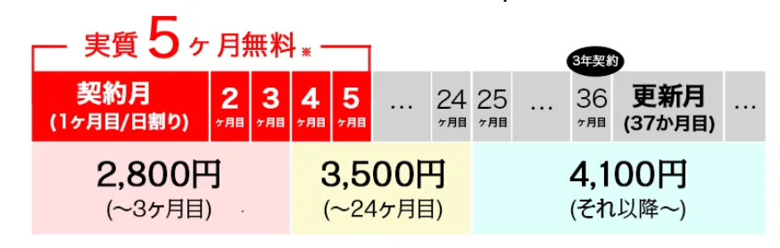 ~3カ月目:2,800円 ~24カ月目:3,500円 25か月目~:4,100円 |