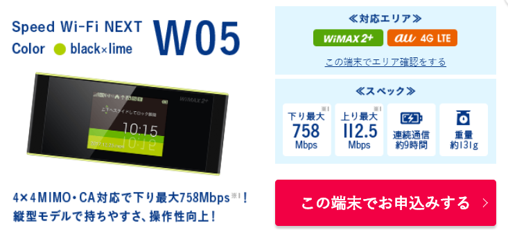 「Speed Wi-Fi NEXT W05」「ブラック×ライム」でお申込み