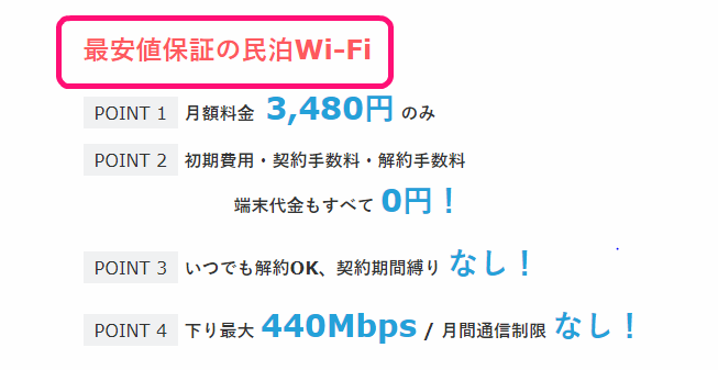 2018年1月1日時点でGoogle/Yahooにおいて「民泊 wifi」と検索した際の検索結果上位10件に含まれるすべての民泊用Wi-Fi商品と比較し、契約から1ヶ月以上利用し解約した際までの「総費用」が最安値であることをお約束いたします。