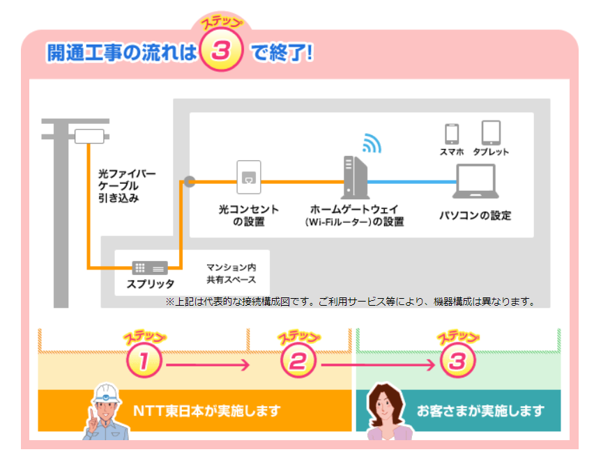 大きくわけて3ステップで開通しますが、団地で光回線の工事ができないのは、②の共有スペースから各住戸をつなぐケーブルが光回線に対応していないのが主な理由です。なのでジェイコム等のケーブル会社経由でネット回線はは引き込めても光回線は引き込めないケースが多いです。