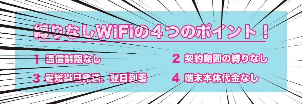 縛り無しWiFiなら契約期間がないのでいつでも切り替え可能!※最低1か月ご利用いただければいつでも解約できます。ただしご解約は前月申請となり翌月末がご解約日となります。