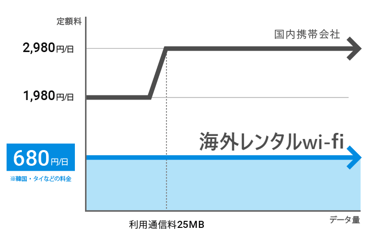 通常、フィリピンをふくむ東南アジアエリアの場合、海外レンタルwi-fiなら600~1000円/1日程度。それに対してスマホキャリアの海外パケット料金はいきなり1980円からスタートして少し利用すれば2,980円という超割高な設定なのです。