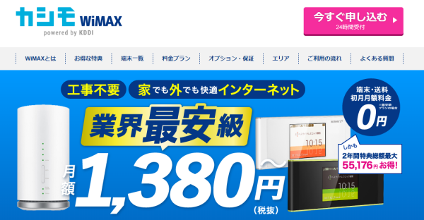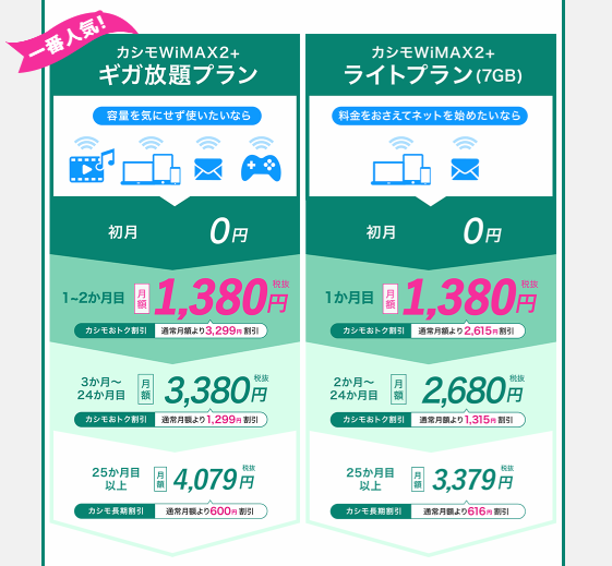 今度は「月額1,380円~」という衝撃のデビューをかざり、一躍人気WiMAXプロバイダに上り詰めたカシモWiMAXをみてみますと・・・