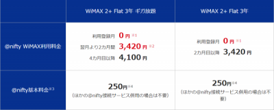 BIGLOBEとならび、新規契約なら約3万円程度のキャッシュバックのある大手ニフティですが、調べてみると2か月目以降はずっと4,100円という月額料金。