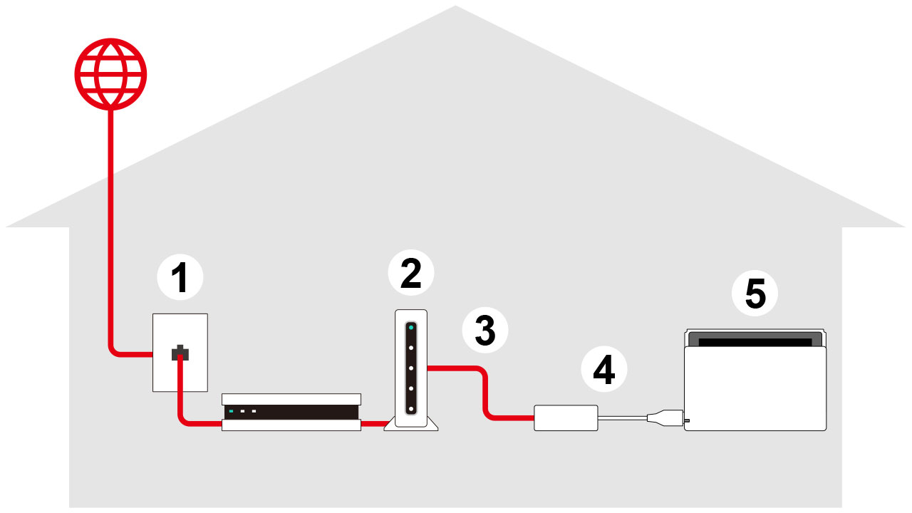 上記の5つ。これも光回線などの固定回線のサンプルなのでモバイル回線の場合、①と②はまとめてモバイルルーター(またはホームルーター)で代用。ちなみに③のLANケーブルは100円ショップでも普通に売られている
