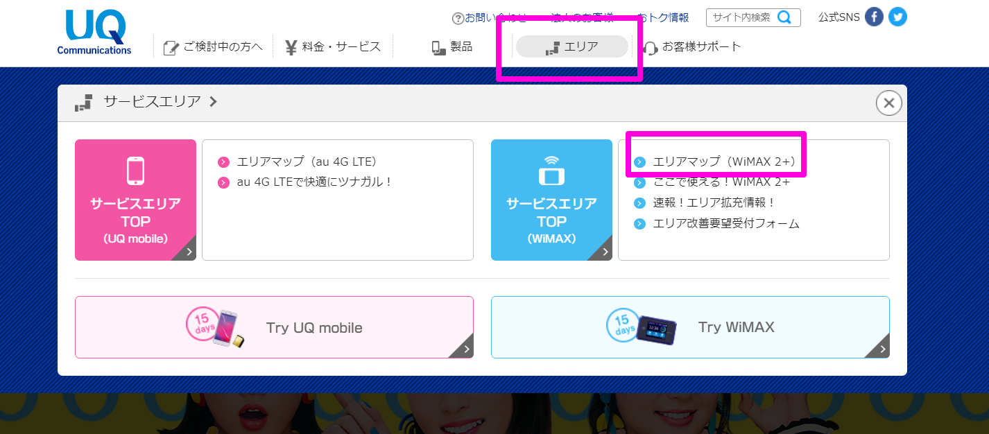 こちら、TRY WiMAXを提供しているUQ WiMAXの公式ページ上部の「エリア」というタブをタップ(クリック)し、「エリアマップ(WiMAX2+)」をタップすると「サービスエリア」の確認ができます。