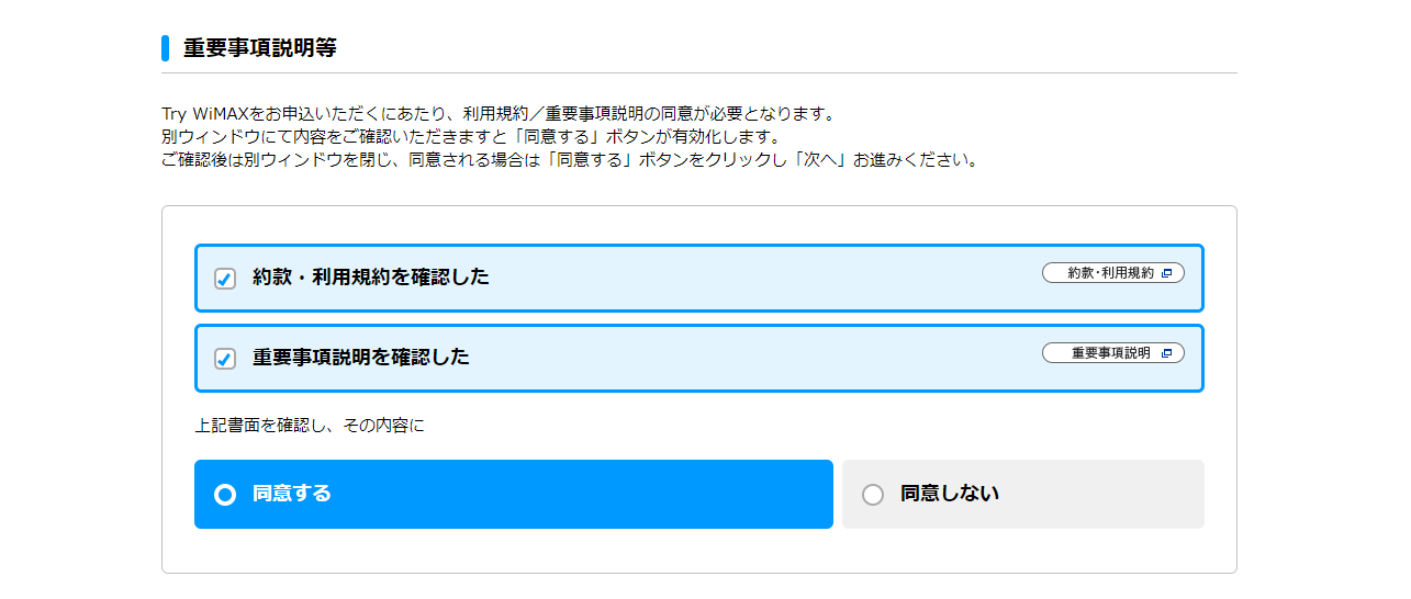 すると「重要事項説明等」というTRY WiMAX利用規約を確認し、同意するページへ。すべての規約に目を通して「同意する」をタップすると