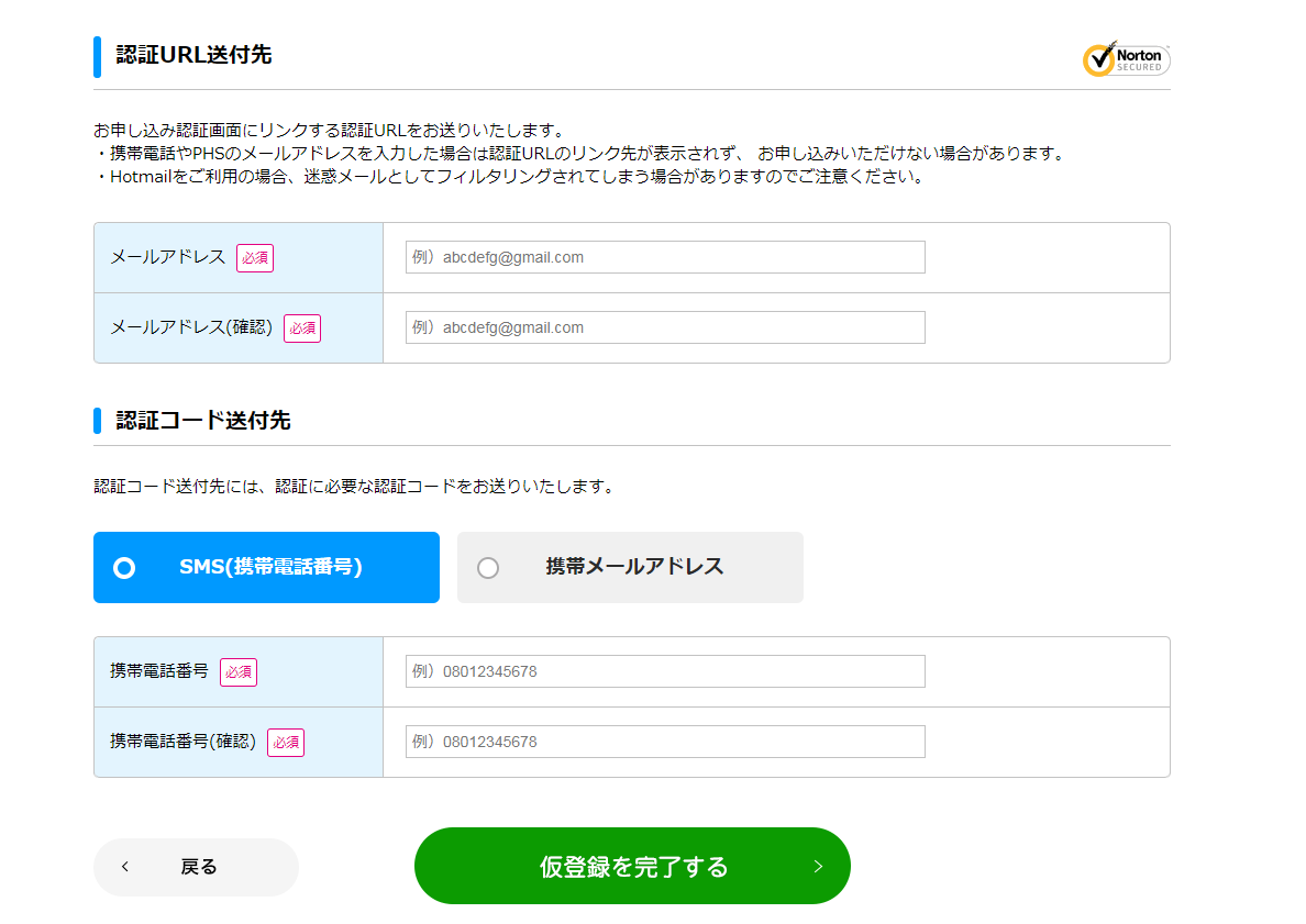 メールアドレスとSMS(携帯電話番号)の入力ページへ。ここまで入力した段階で仮登録が完了し、