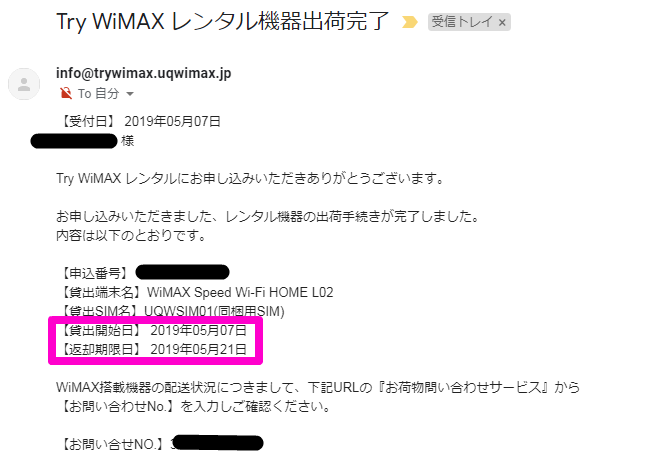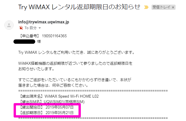 返却期限が終わる数日前に登録したメールアドレスに「Try WiMAXレンタル返却期限のお知らせ」という件名のメールが届きます。