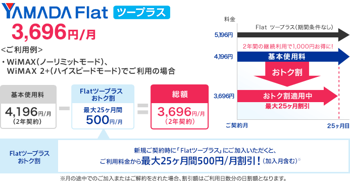 当社指定のWiMAX機器のご購入と同時に、契約期間の設定されたYAMADA Flatツープラス ギガ放題を選択して新たにご加入いただいた場合に、毎月の料金を割り引きます。