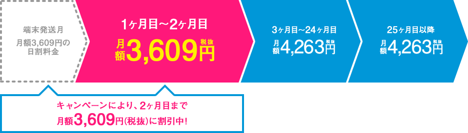 2段階システム 最初の2か月間は3,609円、3か月目以降はずーっと4,263円とシンプルな料金体系!キャッシュバックと組合せれば最安 |