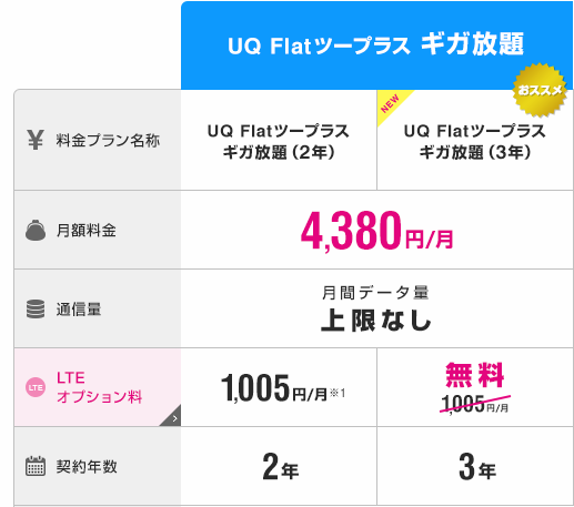 たとえば人気の最新モバイルルーターW05を選択した場合、2年契約・3年契約ともにギガ放題プランなら4,730円/月(最初の3カ月までは3,991円)という設定。